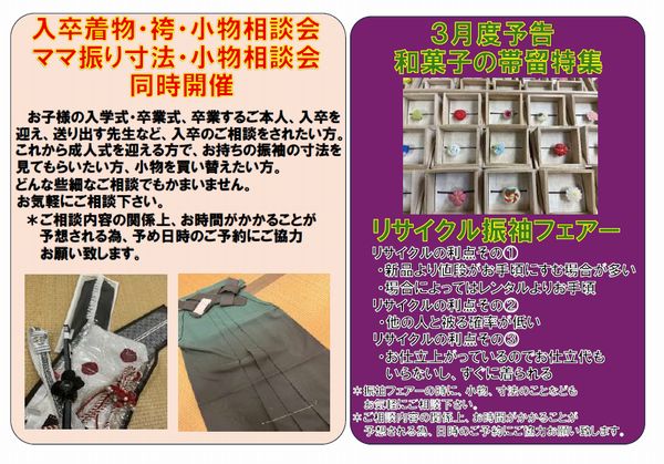 同時開催で、入卒着物・袴・小物相談会、ママ振り寸法小物相談会も開催させて頂きます。こちらは2月の期間中、定休日以外ならいつでも承ります(もちろん2月以外の月でも、いつでもご相談は承りますのでお気軽にご相談下さい)。夫婦二人で営業しているため、なるべくお待たせせず対応させて頂く為に、日時のご予約にご協力お願い致します。