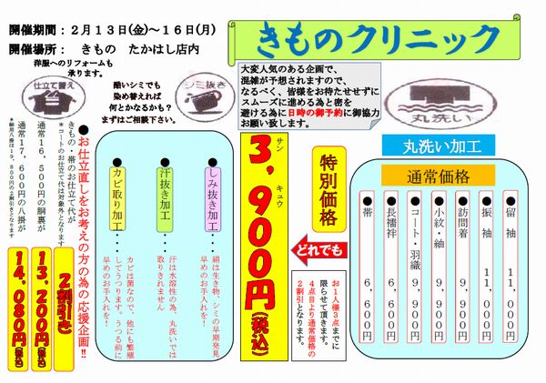 2月度は、2月13日(金)~16日(月)の4日間の期間で、毎回好評の【きものクリニック】を開催致します。きものの丸洗いが3,900円、お仕立代、裏地が2割引き(羽織・コート仕立は除く)になります。洗いはもちろんですが、お仕立直し、染め替え、仕立てていないお着物をお持ちの方は、この機会にお持ちいただくとお得だと思います。この期間は混雑する為、日時のご予約にご協力お願い致します。